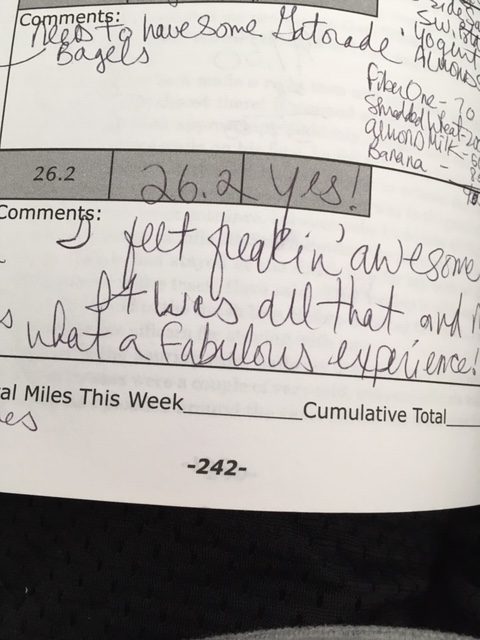 Thanks to a great marathon training book (The Non-Runner’s Marathon Trainer), I tracked every day of every week of those four months until I reached my destination of 26.2 miles. I worked on positive thinking in addition to the physical training, but the journey itself was just as important. On this run (excerpt above) I did not have a solid plan for my run and my motivation wavered at the end. This is so true in any goal that we have: we need to map it out in terms of what we need to do in order to achieve what we want. I was not clear about where I was going to run for 16 miles and it took more energy to improvise. Want to eat more healthy meals to lose weight? Don’t wait until you’re hungry to try and figure out what you need. Plan one or more weeks at a time and focus on your end result: feeling and looking fantastic! I told myself at the start of the race that “it was an awesome run,” and by the finish line, it truly was. Believe, have a plan and make it happen!